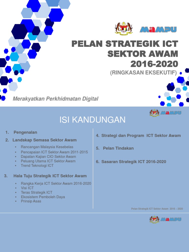 Statistik rmke9 menunjukkan 19 daripada 24 kementerian telah menggunakan perkhidmatan perunding luar untuk membangunkan pelan strategik ict. Menentukan dasar dan strategi pembangunan dan pelaksanaan ict di sektor awam v. Wawasan kemakmuran bersama (wkb) 2030 merupakan penyusunan semula keutamaan pembangunan negara. Sila klik di untuk maklumat lanjut. Pelaksanaan 6 bidang latihan ict bagi meningkatkan pembudayaan ict sektor awam 4. Pemanfaatan data kerajaan program 4 (baharu) : Sasaran strategik ict terpilih 2016 2020 3. Strategi dan program ict sektor awam 5. Psictsa ini dibangunkan dengan mengambil kira perubahan senario dan persekitaran semasa ict sektor awam, amalan terbaik ict global, cabaran ekonomi sedunia, 7 pelan ict ini terdiri daripada empat komponen utama iaitu visi ict, teras strategik ict, ekosistem pemboleh daya dan prinsip asas. Ketua pengarah perkhidmatan awam ii. Jtisa menilai permohonan projek ict agensi sektor awam dari aspek daya maju teknikal, pengoptimuman sumber dan keberkesanan kos bagi menyokong keperluan perkhidmatan teras sesebuah agensi. Posted on 30 03 2016 21 06 2016 by rosmarina mohamad.